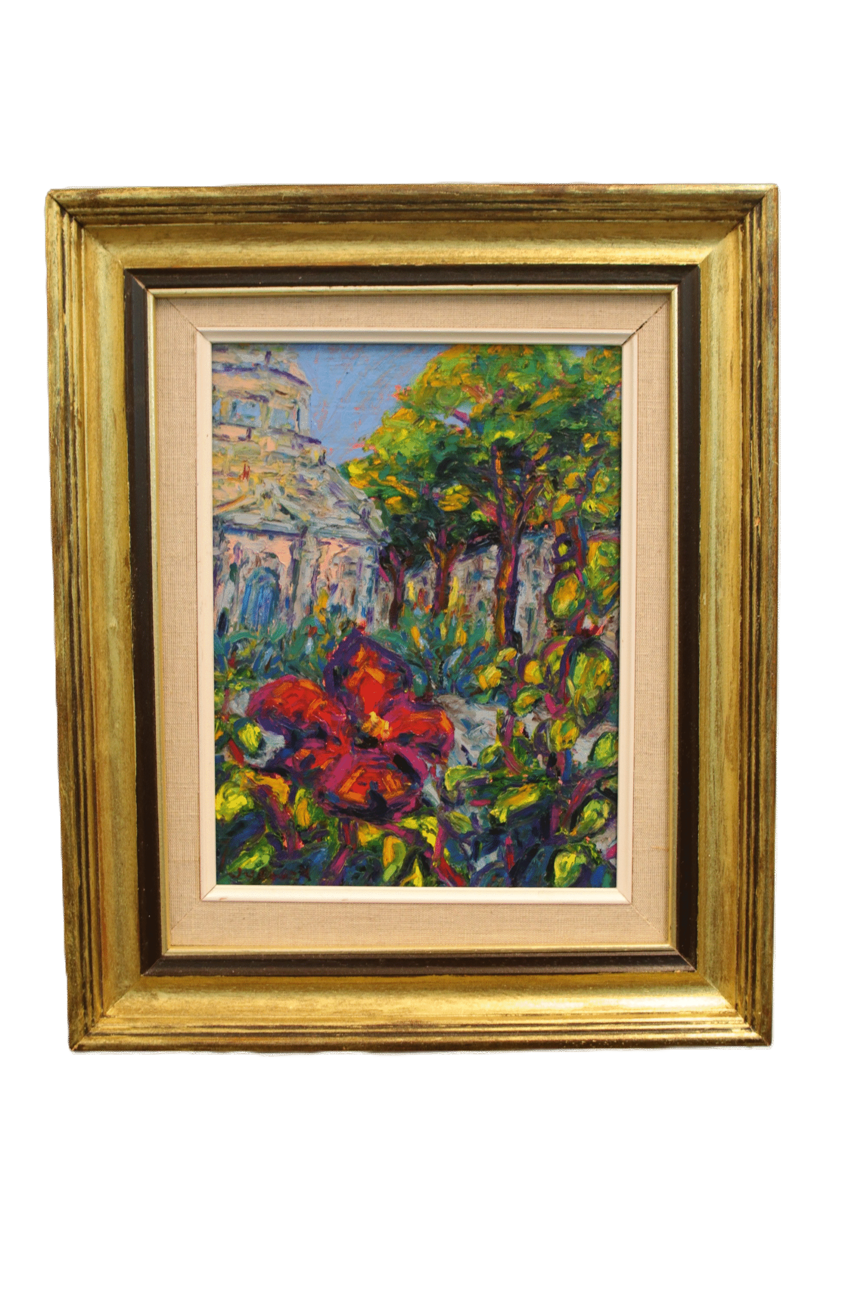 Inspired by a trip to Rome and the Villa Borghese Gardens, this Impressionistic oil stick painting features a striking red flower blooming before an ancient Roman temple, blending vibrant color with classical architecture. This small painting was done on a canvas panel, and it has been framed in a thick black frame partially gilded with Goldfinger Metallic Paste.