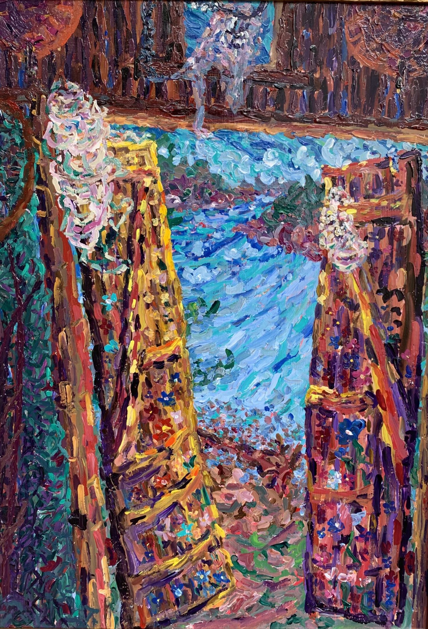 This painting was painted plein air in the archipelago south of Espoo. The dark wooden interior of the boathouse is contrasted with bright turquoise and blue shades from the distant clouds and flowing sea water.