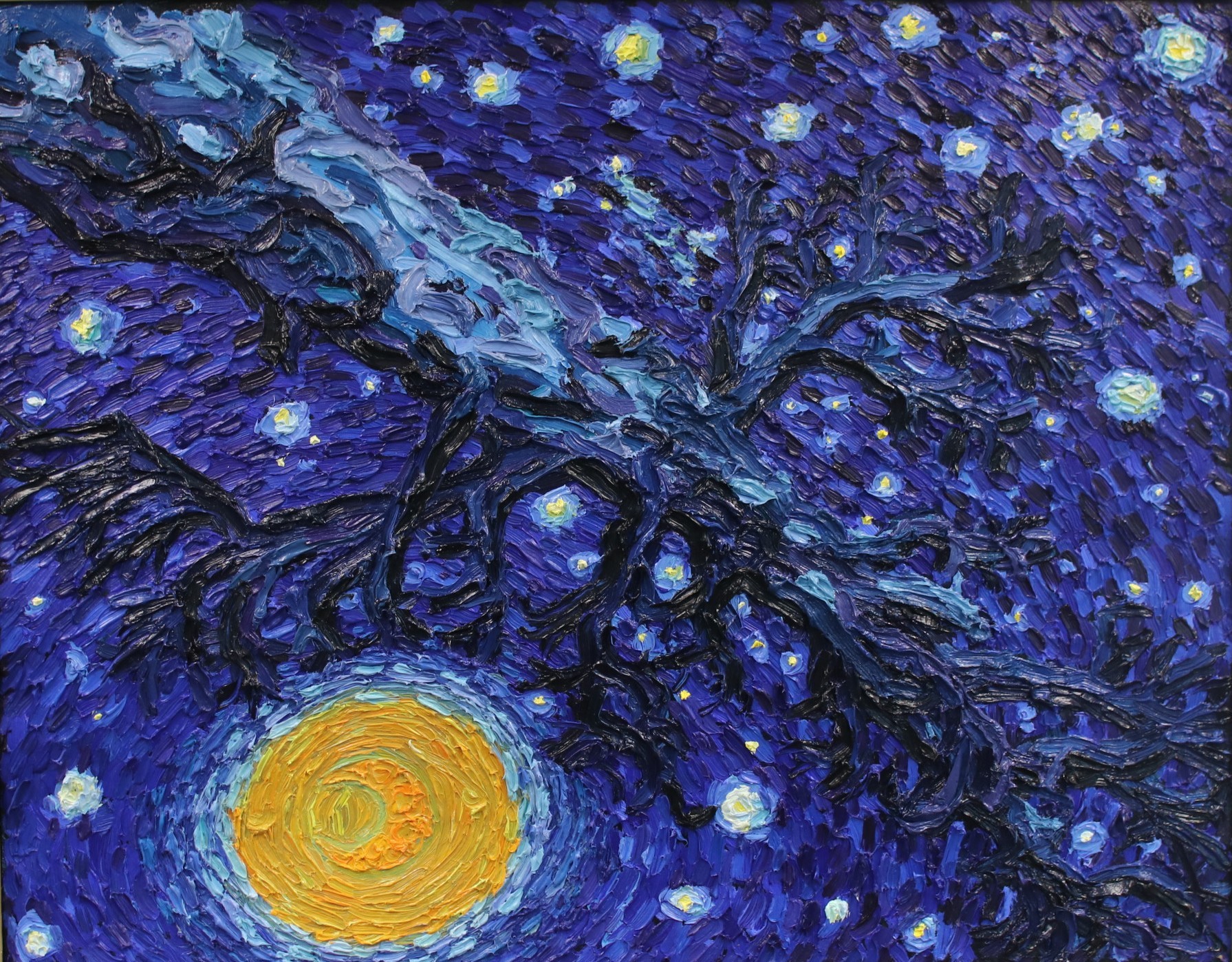 Continuing the starry night motif. This time gazing up to the sky through branches of a dead tree. The night sky represents an infinite scene in history of our time, evoking absolute wonder and mystery.