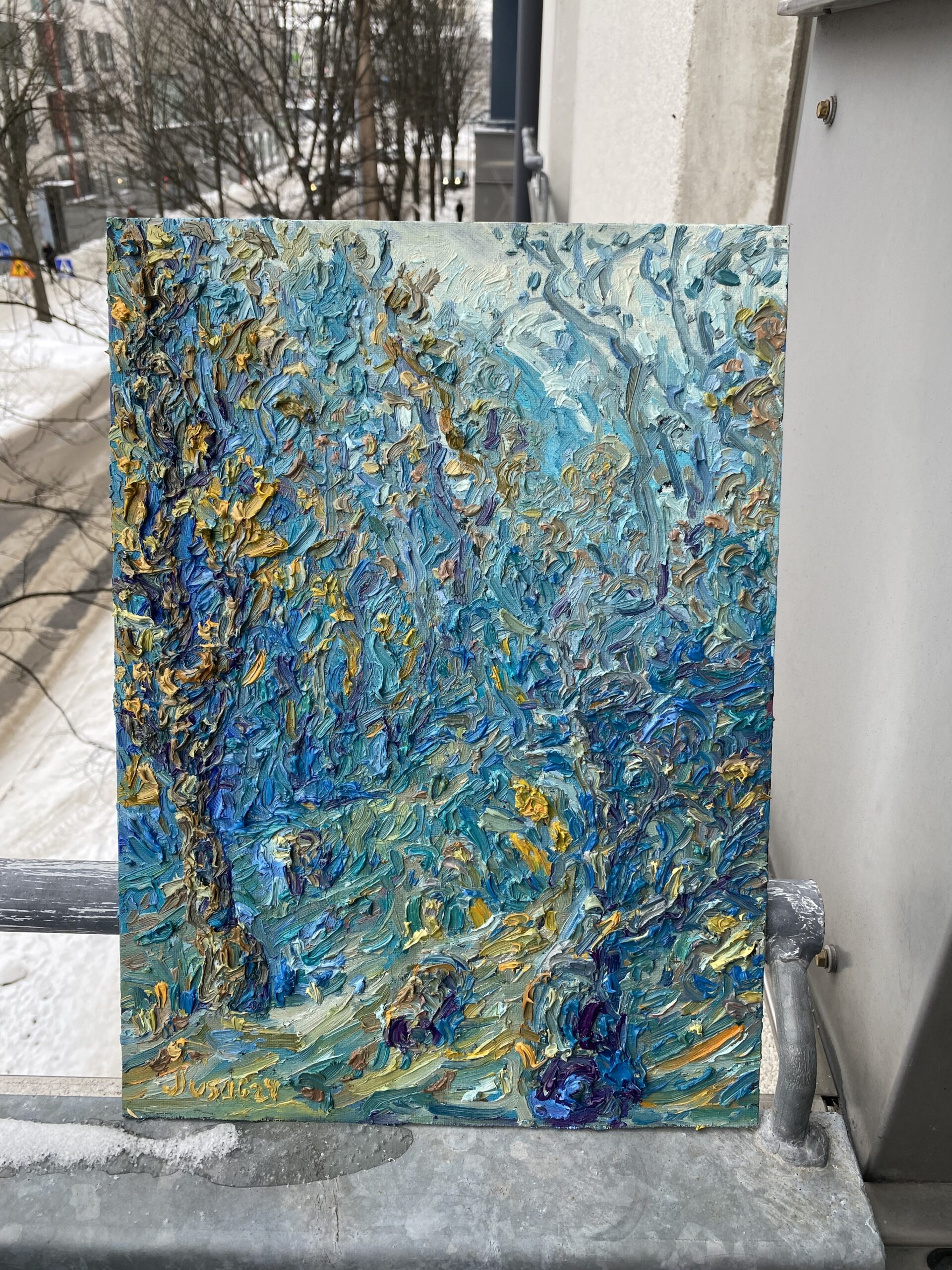 A continuation of my sous-bois series from Kivinokka, this piece captures the forest in its final transition before winter. The composition celebrates the ‘fleeting fall’ through a vibrant contrast of orange foliage against a cool palette of turquoise and grayish blues. Using heavy impasto marks, I’ve built a tactile surface that brings a striking three-dimensionality to the thicket and forest floor, inviting the viewer to step directly into the autumn chill.
