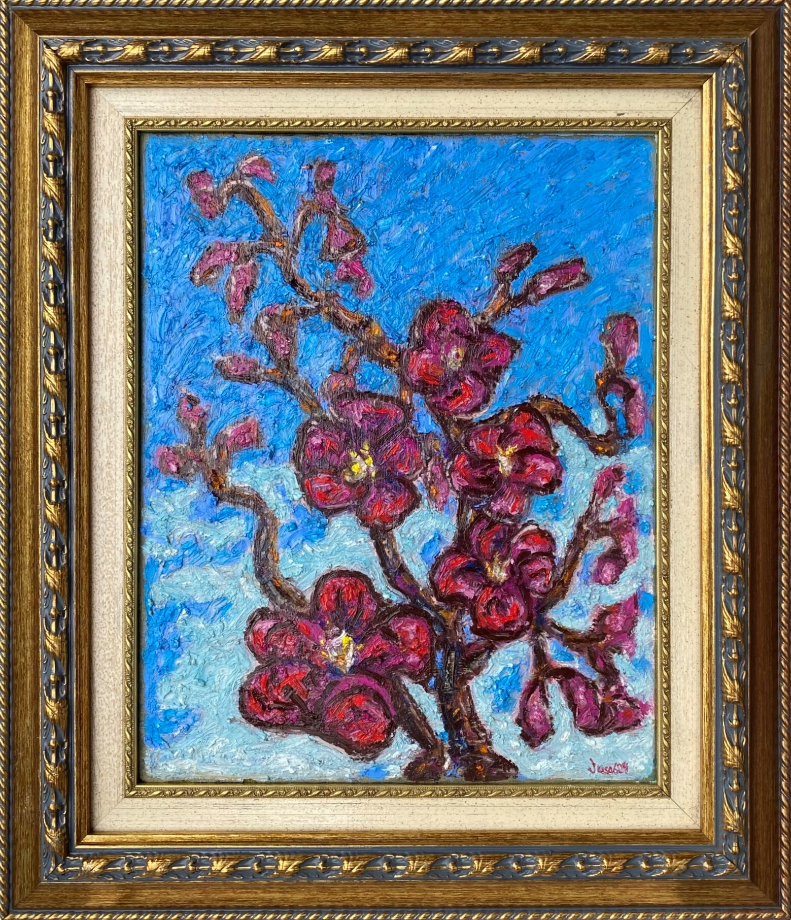 A popular subject in East Asian art, the plum blossom symbolizes resilience and the first breath of spring, blooming bravely on bare branches amidst the winter chill. As my first painting of 2026, this piece captures the plum blossom’s delicate pinks and deep reds against a backdrop of cool winter blues and teal-toned clouds. Executed with oil sticks, the work features tactile impasto marks and bold outlines, a contemporary nod to the graphic beauty of Japanese woodblock prints