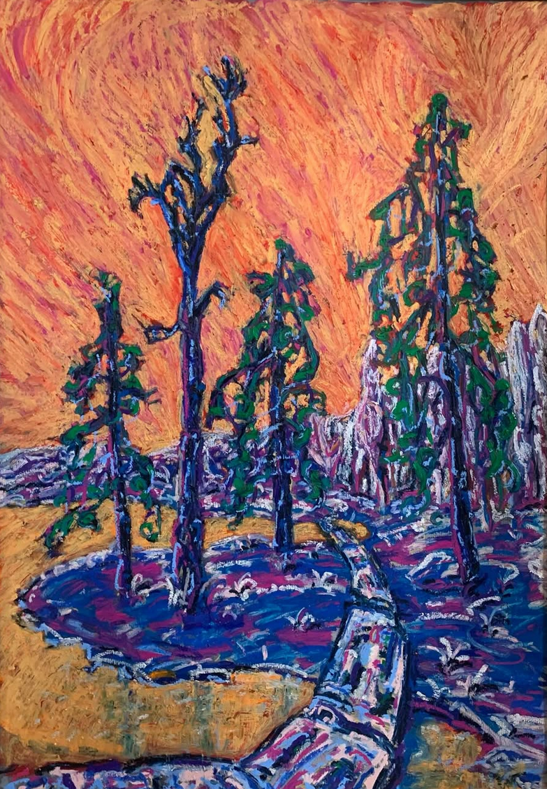 My summer excursion to Patvinsuo, North Karelia, sparked a creative journey. I photographed and sketched, mesmerized by the dead trees and vast expanses. Initially, I envisioned a night scene, but vibrant cadmium red, qinacridon magenta, and gold ended up transforming the scene. I’m still thinking whether this painting is still work in progress, or maybe I should focus on making additional versions of the scene.