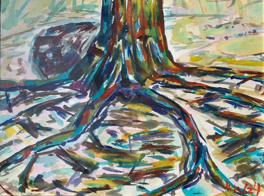 This beautiful tree trunk and roots caught my attention straight away. I’ve wanted to paint this subject since seeing the same motif in Vincent’s last painting before his death. Vincent depicted the roots as light blue and I wanted to do something similar with hues of turquoise blue. Despite the different medium, I try to unify my work by using similar palette as in my oil paintings.