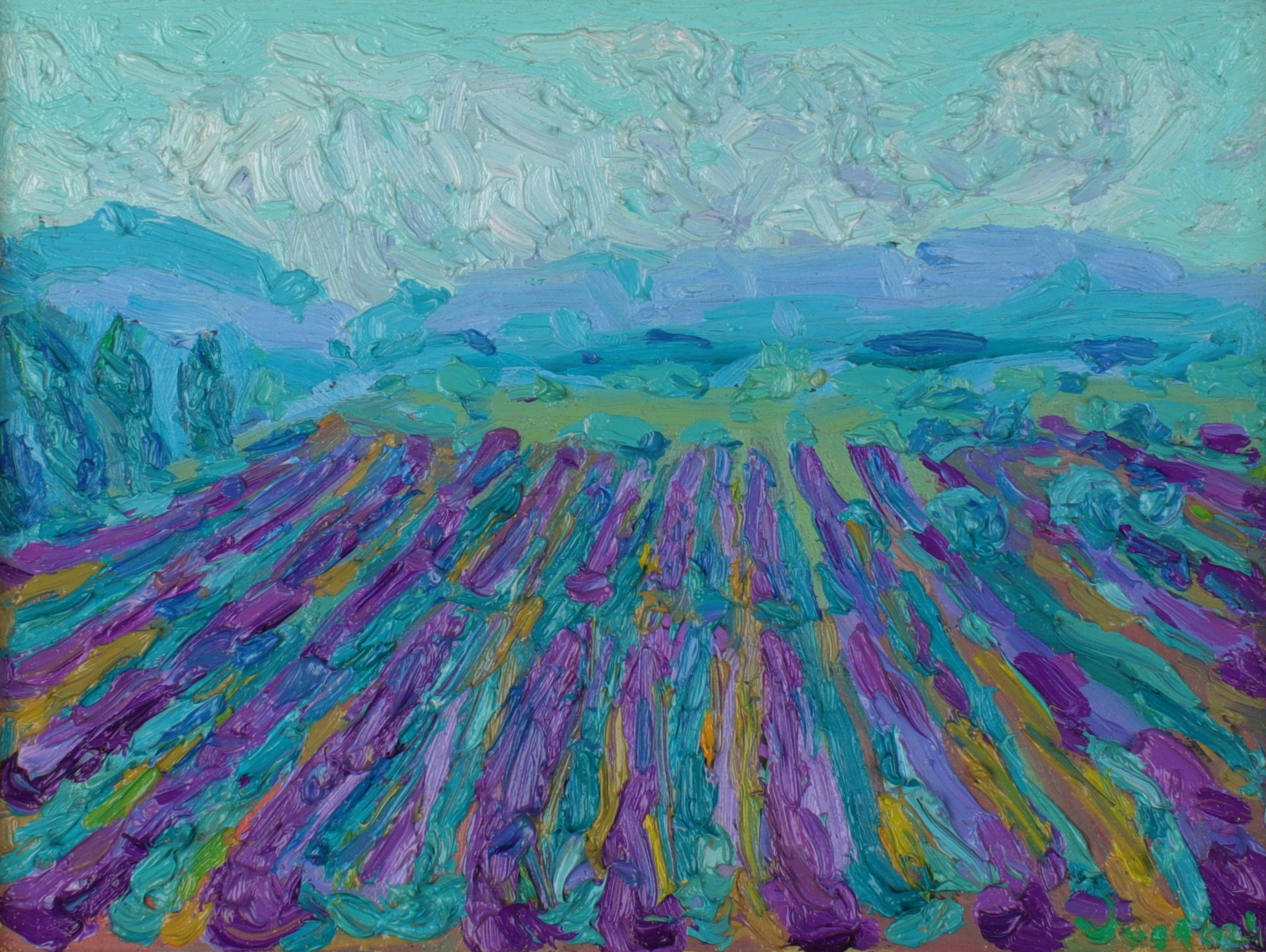 This work depicts the violet lavender filled landscapes of Southern France. It is rendered from an aerial perspective, creating a dramatic interplay between the earth and the sky. Below, the Valensole lavender fields unfold as an abstracted, textural expanse of deep, rich violet. This intense foreground pushes back against the cool serenity of the immense blue mountains meeting a cool sky layered with light turquoise-blue clouds. The work captures not just the sight, but the breathtaking, expansive atmosphere of the region.